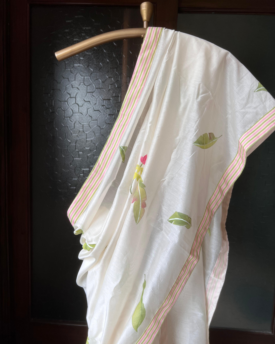 Every saree is painted by hand — no two are ever alike, making yours a one-of-one masterpiece. The motifs flow organically across the fabric, reminiscent of soft summer breezes and tropical calm.