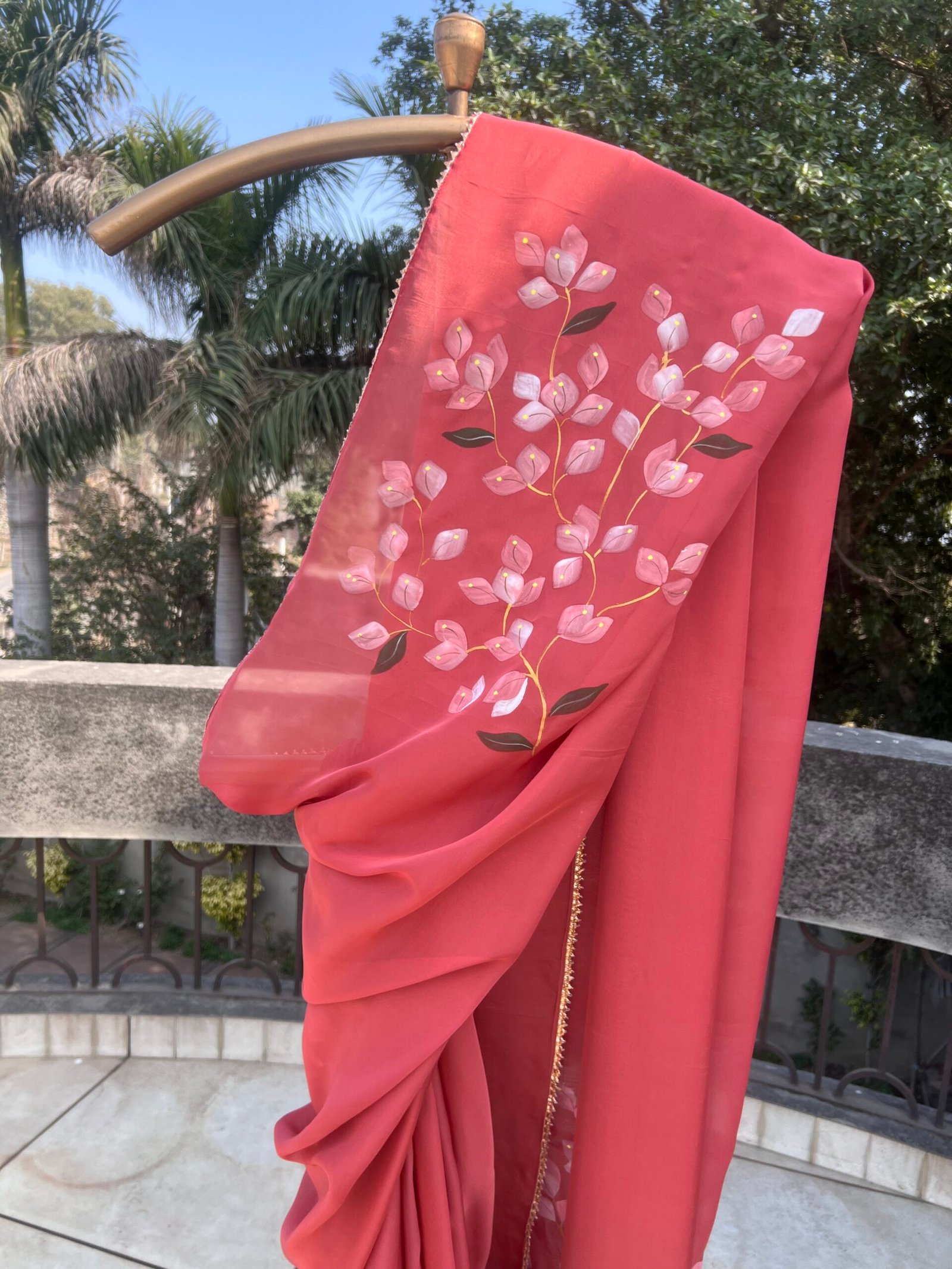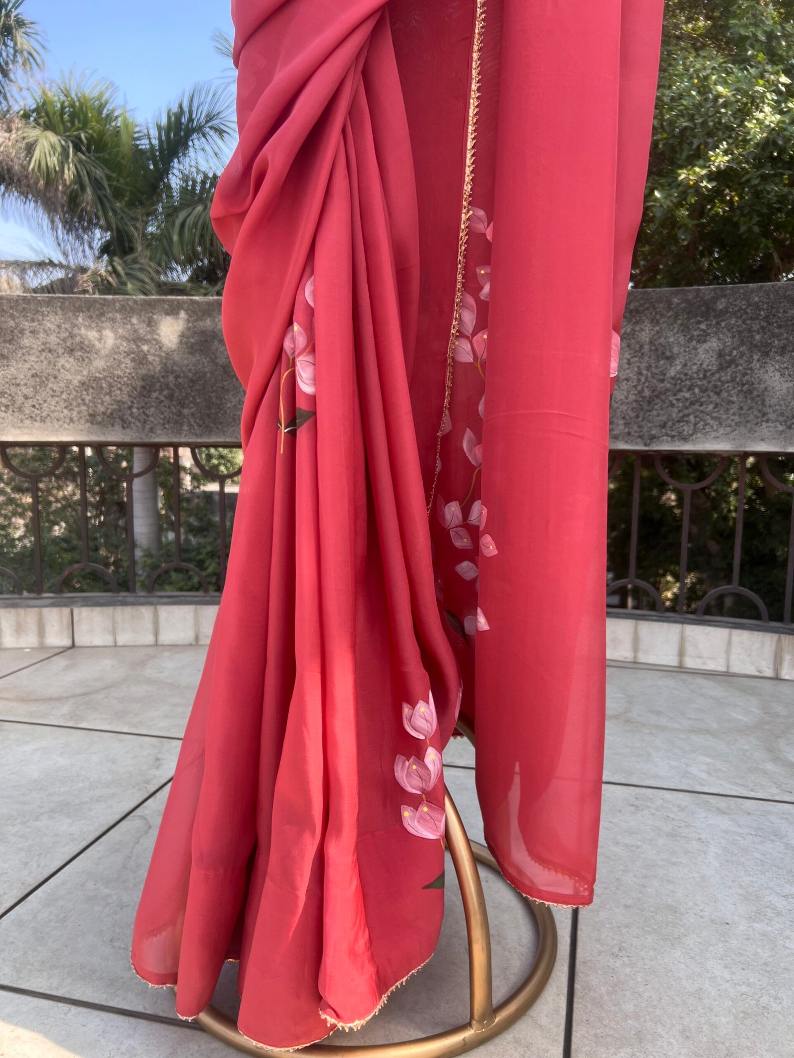 Bold yet breathtakingly delicate, the Bougainvillea Brick Red Organza Saree is a tribute to nature’s most radiant bloom. Hand-painted bougainvillea florals unfurl across a deep brick-red organza base, creating a striking contrast of vibrance and sophistication.
