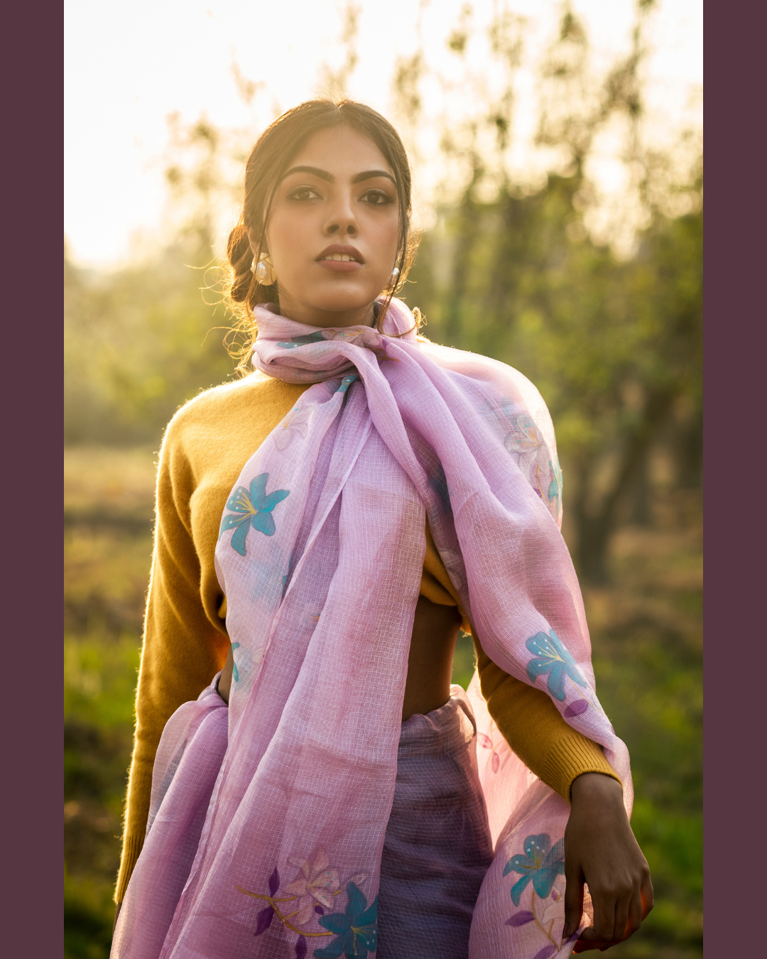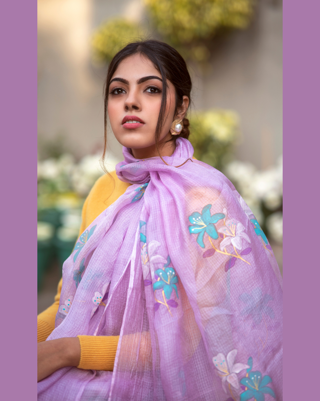Gentle as twilight and graceful as a blooming garden — the Lily Lilac Kota Doria Silk Saree is a vision of refined femininity. Hand-painted lilies blossom delicately across a soothing lilac kota doria silk canvas, creating a look that is serene, elegant, and effortlessly luxurious.