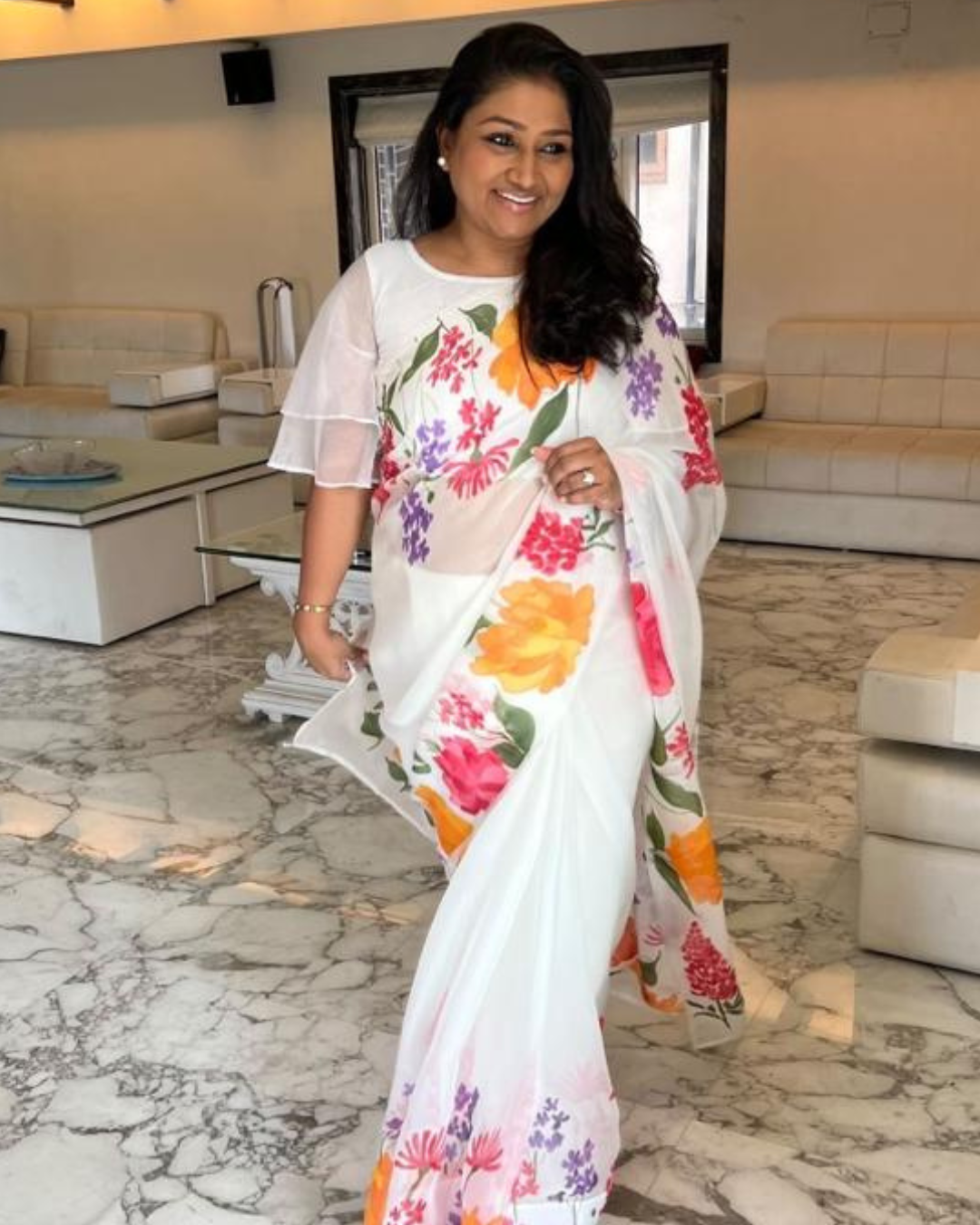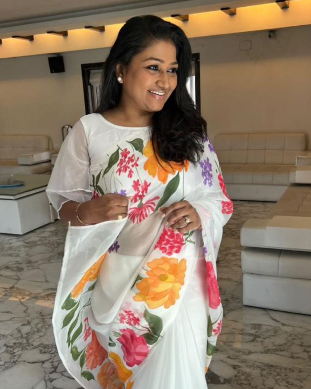 Named after the word Zahara — meaning radiance and blooming beauty — this saree is a celebration of color, craft, and light. The Zahara White Organza Saree features hand-painted multicolour florals dancing across a pristine white organza canvas, creating a composition that feels joyful, elegant, and effortlessly graceful.